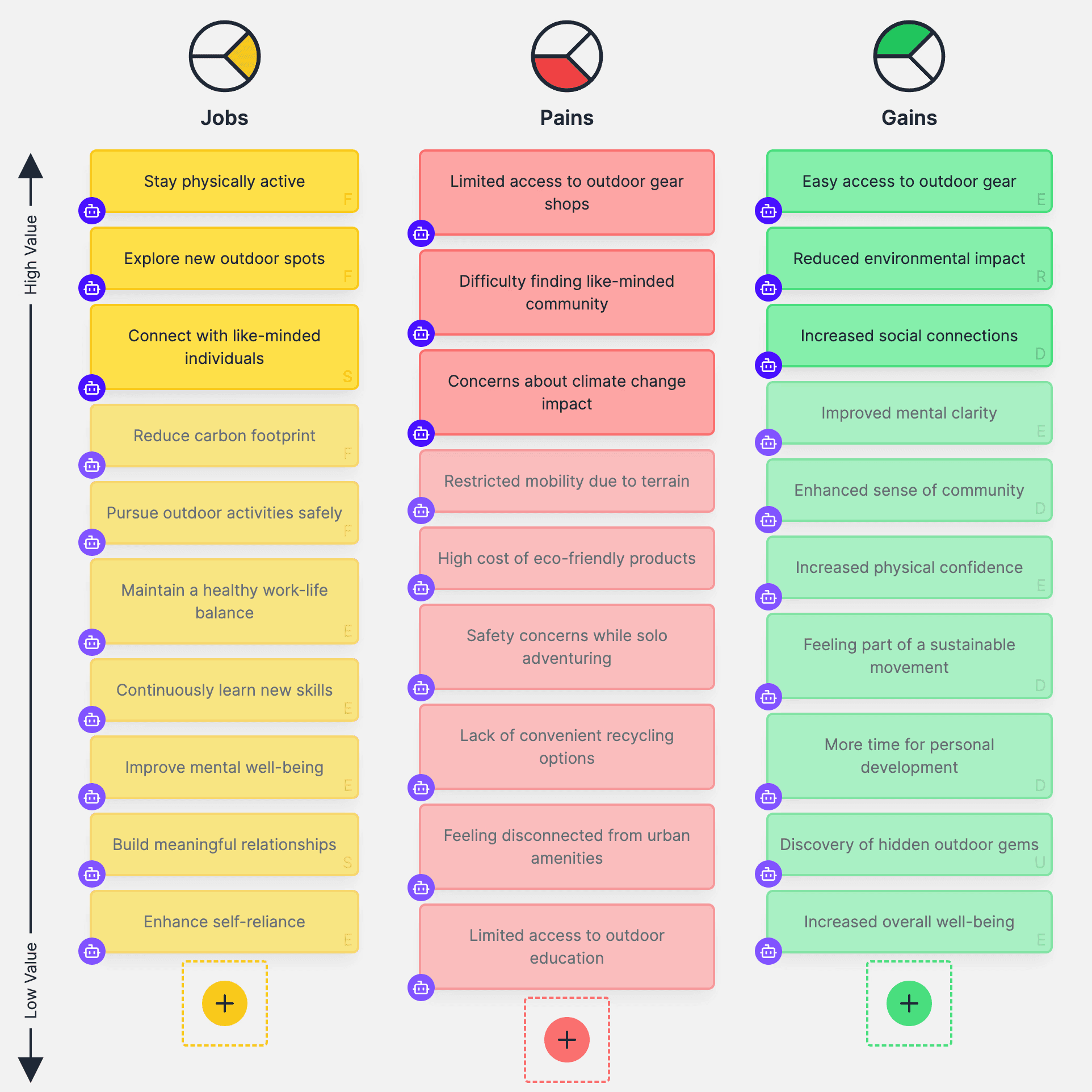 Start with what you know about your idea/business and let AI guide the rest. Let our expert AI make suggestions to your business model that you can discuss/edit/accept with your team. Create visuals of your value propositions and customer segments, as well as storyboards that communicate your idea in mere seconds!